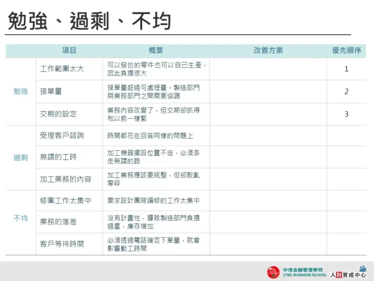 「 勉強、過剩、不均 」是找出為了達成目標而投注的資源有什麼問題,並加以改善的框架 。勉強是達成目標所需的資源不足,負荷過高。過剩是投注了過多的資源,使資源無處可用的狀態。不均則是工作項目沒有標準化,導致因人或時間點改變而出現不同做法,產生勉強或過剩的狀態。