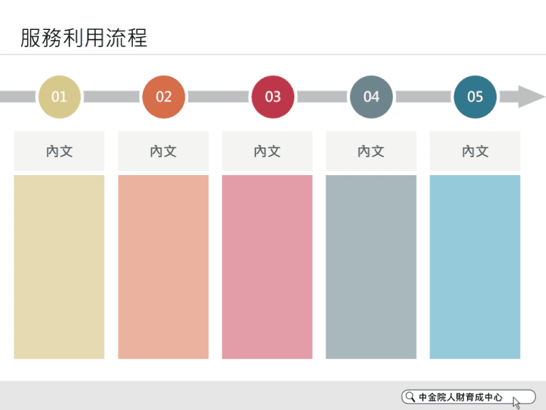 圓圈方塊版 服務利用流程 PPT下載:用五個步驟來說明服務利用的流程。