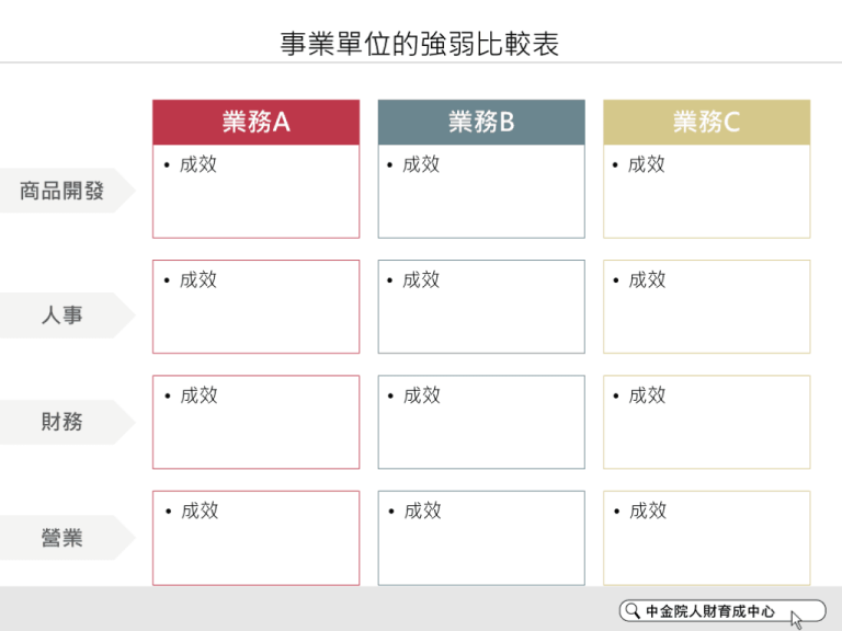 條列方塊版 事業單位強弱比較表:呈現各單位的業務及其成效。可以一眼看出事業的強項及弱項。