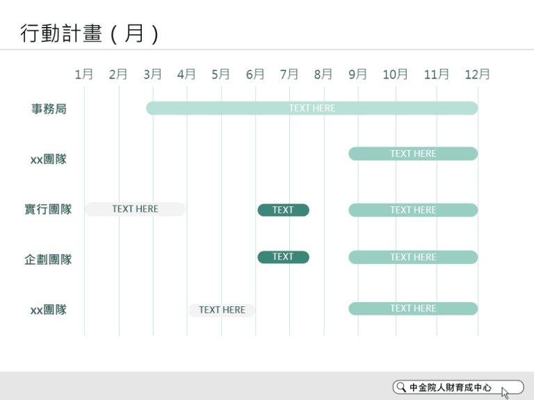 企業版 行動計畫(月) 簡約線條版PPT下載:將一年分劃成12個月的時程表。呈現各個企畫團隊所執行的內容,以及該團隊執行完成後交接給哪個團隊。