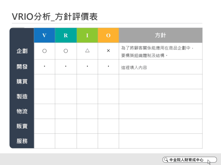 彩色原方格版 VRIO分析_方針評價表 PPT模板:從VRIO(經濟價值.稀少性.模仿可能性.組織)這四個觀點,來評斷各項目的方針時,可以使用這張表格來進行評斷和分析。