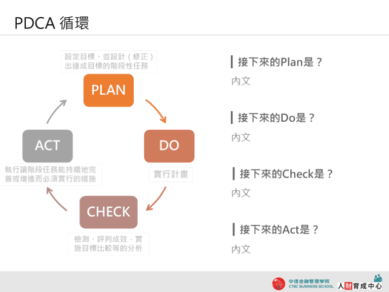 圖文迴圈版 PDCA分析 PPT下載:PDCA是透過將「計畫(Plan)」「執行(Do)」「檢測(Check)」「改善(Act)」這四個步驟不斷重複,即可以持續性地改善企畫或是業務的工具。