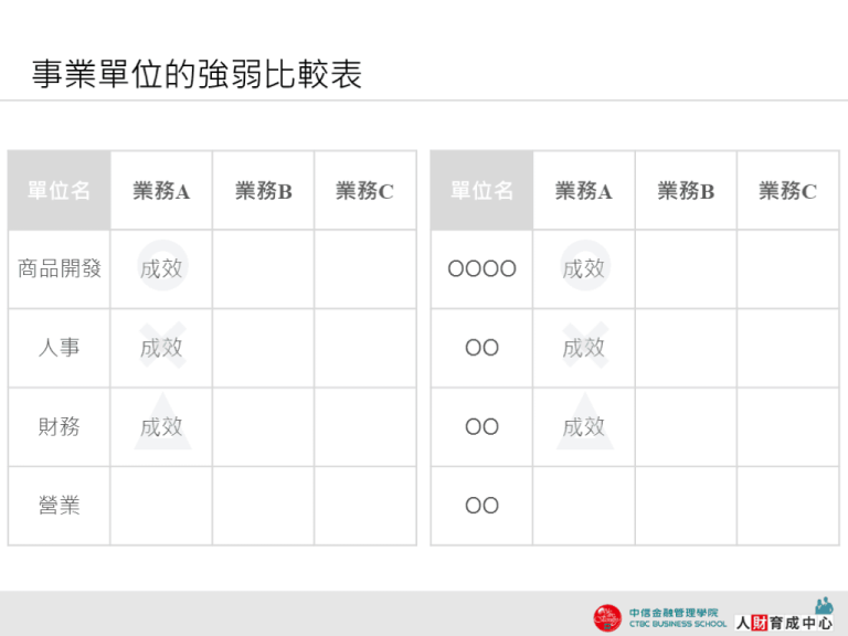 企業用 事業單位強弱比較表:呈現各單位的業務及其成效。可以一眼看出事業的強項及弱項。