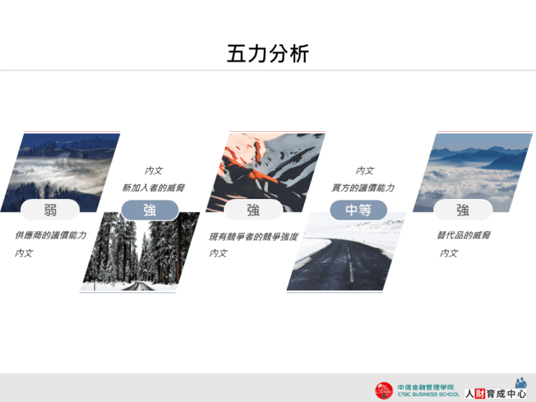 圖文時間軸版 五力分析 PPT模板:5力分析是從以下五個會影響業界收益的決定性因素組成的,分別是「新加入者的威脅」「供應商議價能力」「買方議價能力」「替代品的威脅」「現有競爭者的競爭強度」。