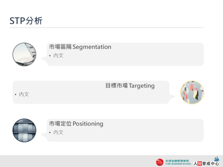 圓形說話框 STP分析 PPT模板:STP分析是將市場行銷的策略步驟,定義為「市場區隔」「目標市場」「市場定位」三個步驟的分析。