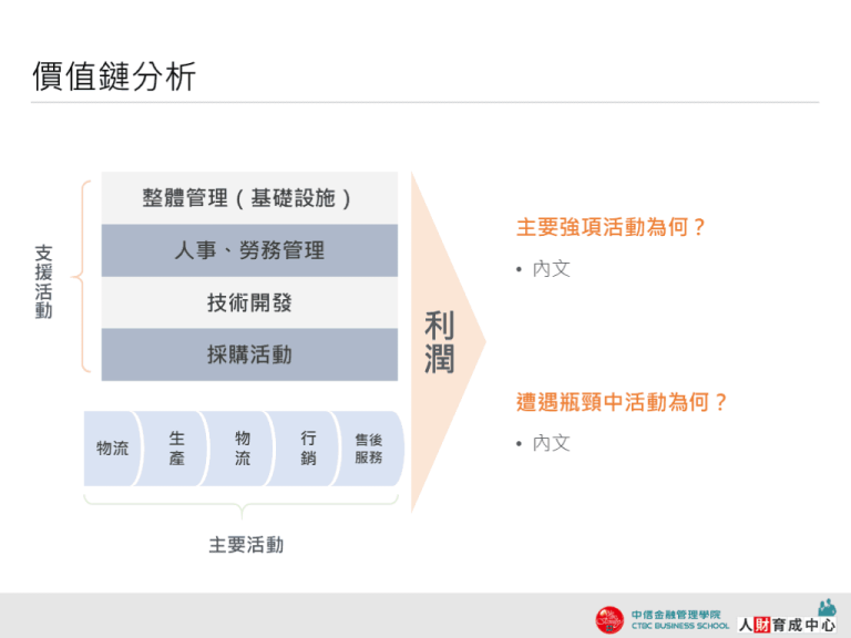 企業版 價值鏈分析:有助於分析事業活動的階段任務(功能性)有無競爭力的工具。將事業活動分成個階段,可以分析出有價值且有競爭力的階段任務為何。