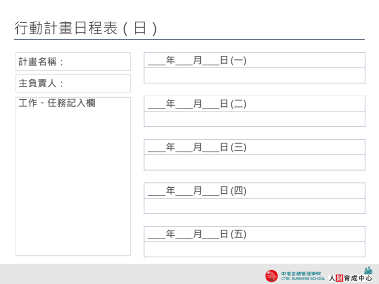 企業用 行動計畫日程表:以負責工作的人員為單位,將一周的工作、任務以及每日進行的業務等詳細記入日報表格。