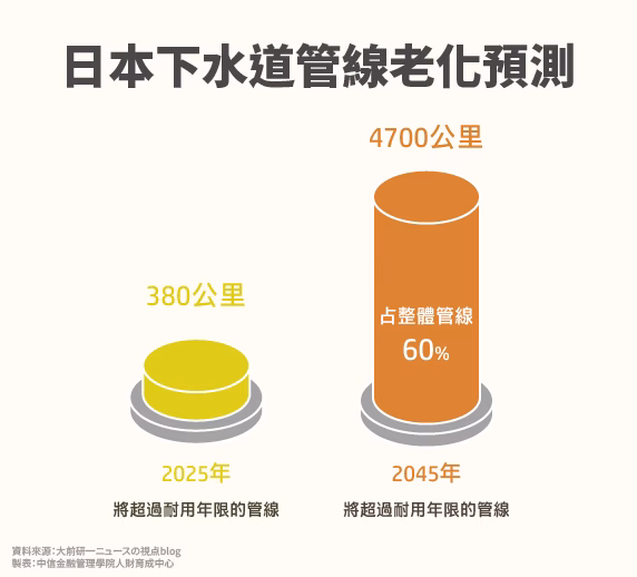 在日本,各類社會基礎設施—包括下水道管線、橋樑、隧道與港灣等—正面臨日益嚴重的老化挑戰。特別是大規模的下水道管線,有研究指出,其中相當比例的管線已接近或超過法定耐用年限50年。據估算,截至2025年,整體管線中約4.87%(約380公里)將超過耐用年限,而再過20年後,這一數字將攀升至4,700公里,相當於整體管線的60%將步入老化階段。如此龐大的基礎設施老化規模,不僅將帶來高昂的維修與更新成本,更可能引發道路塌陷等嚴重的公共安全危機,對社會運作與民眾安全構成重大挑戰。