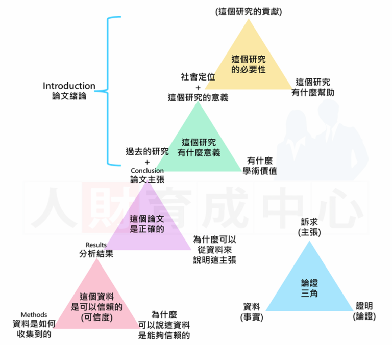 基於上述,構成論文的 論證三角 最少也要4個(=2×2),這樣也會更清楚更完善。