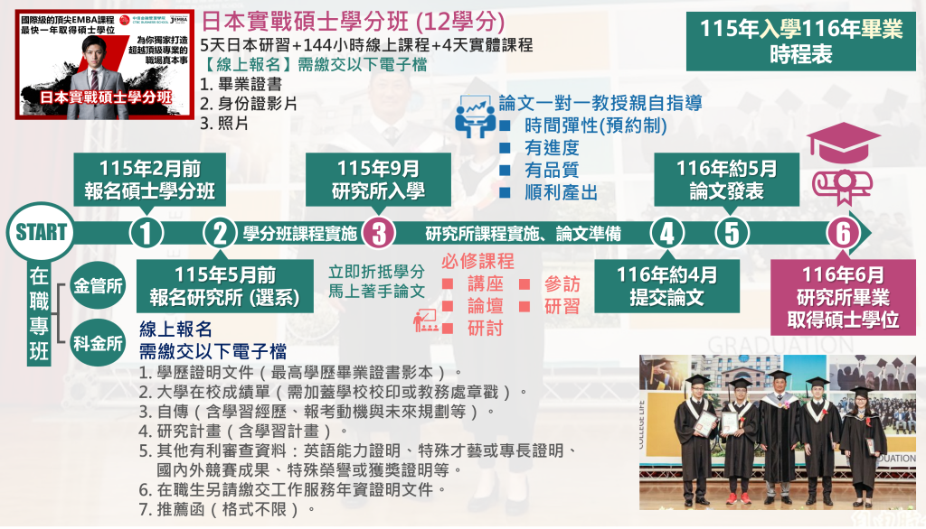 本校提供可先修12學分的彈性制度,完成後可抵扣正式研究所學分,等同縮短近一年的上課時程。進入研究所後即可開始論文準備,並由教授與輔導團隊全程陪伴,協助學員順利於一年內取得碩士學位。對欲升遷、轉職或拓展國際人脈的在職人士而言,這是最有效率、最穩健的進修途徑。
