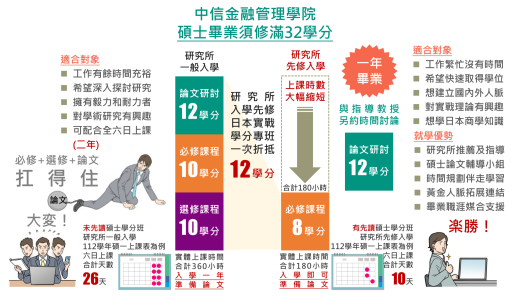 一般研究所需兩年以上修滿學分,對工作繁忙或無法長時間上課的在職人士而言,往往難以兼顧。若你希望在不影響職場表現的情況下,兼顧學位與職涯進展,中信金融管理學院的「碩士學分班」將是理想選擇。
