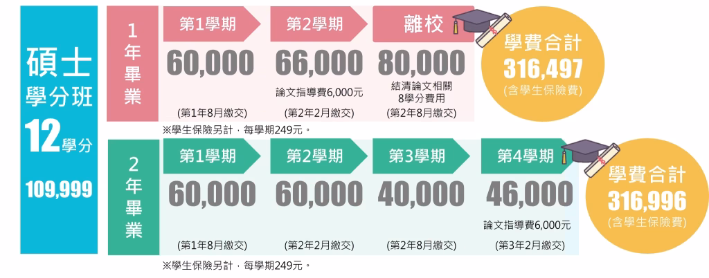 學分班學費 12×10,000 + 學生保險 249×2學期 + 論文指導費 6,000NT$316,497